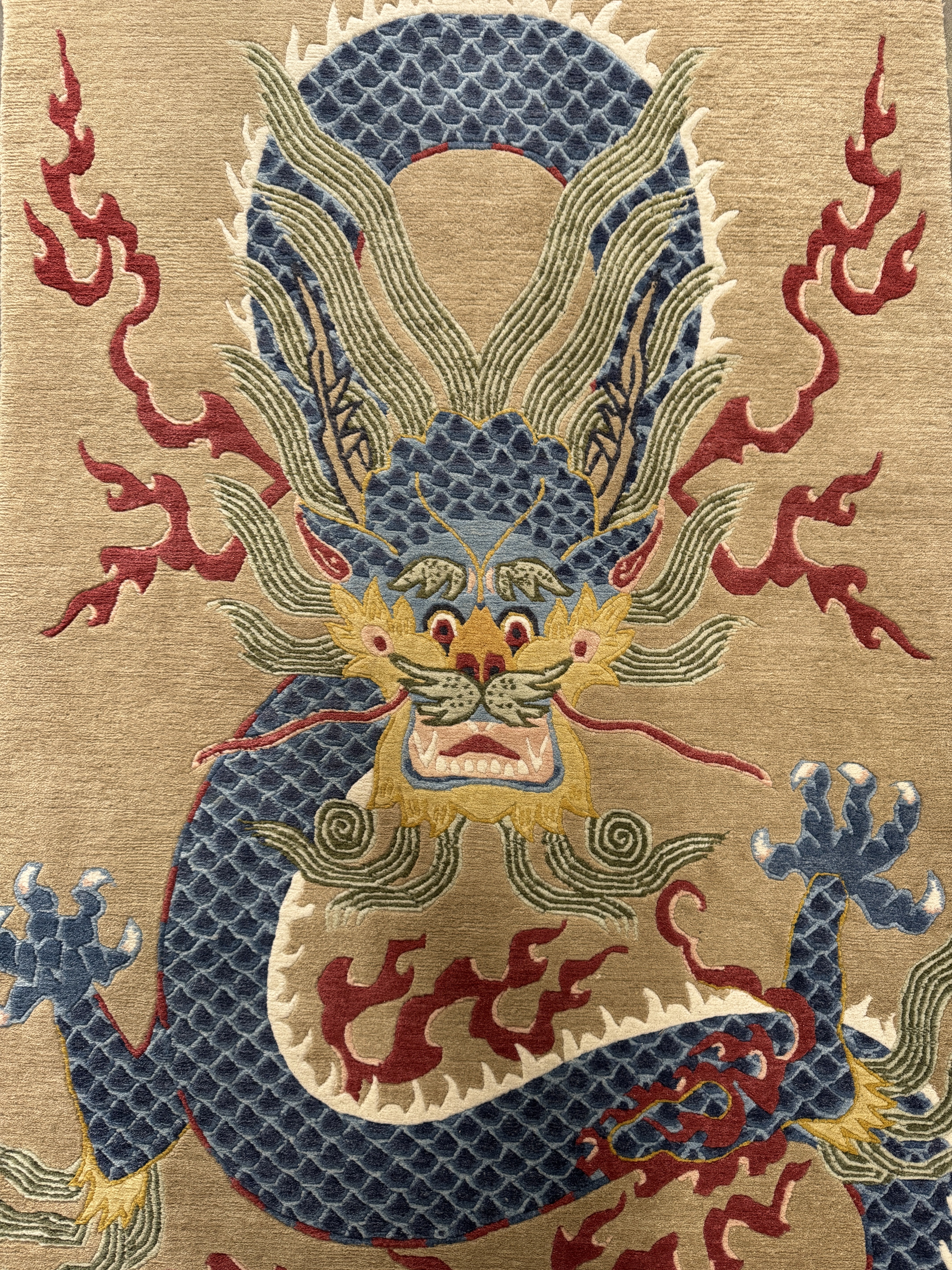 The multi-color complexity of the design creates dye stability considerations that require careful assessment before any water contacts the rug. The deep blue-grey of the dragon body, the saturated crimson of the fire clouds, the warm gold of the accents and the ground field — these are multiple distinct dye chemistries in close proximity. Dye migration between any of these elements would damage the rug permanently and irreversibly. We test every color zone before washing and adjust our cleaning approach accordingly.
